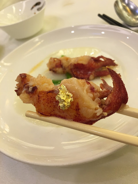 吃過乳鴿後,矜貴的加拿大龍蝦兩食就要出場了,龍蝦分成兩種食法,分別是「金網龍蝦燴翅」以及「蛋白蒸龍蝦鉗」聽見名字經已令人垂涎三尺。再看到實物「哇~!」杯內金黃色的燴翅上放上了一只大龍蝦,杯子旁邊有著少量花瓣在陪襯,精緻非常。而另一邊廂就有蛋白蒸龍蝦鉗,底下有著一層雪白色的蒸蛋白,而大大只的龍蝦鉗上就放有一片小金箔,顯得格外矜貴